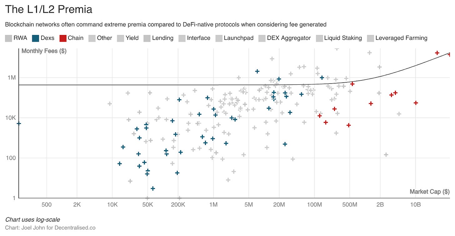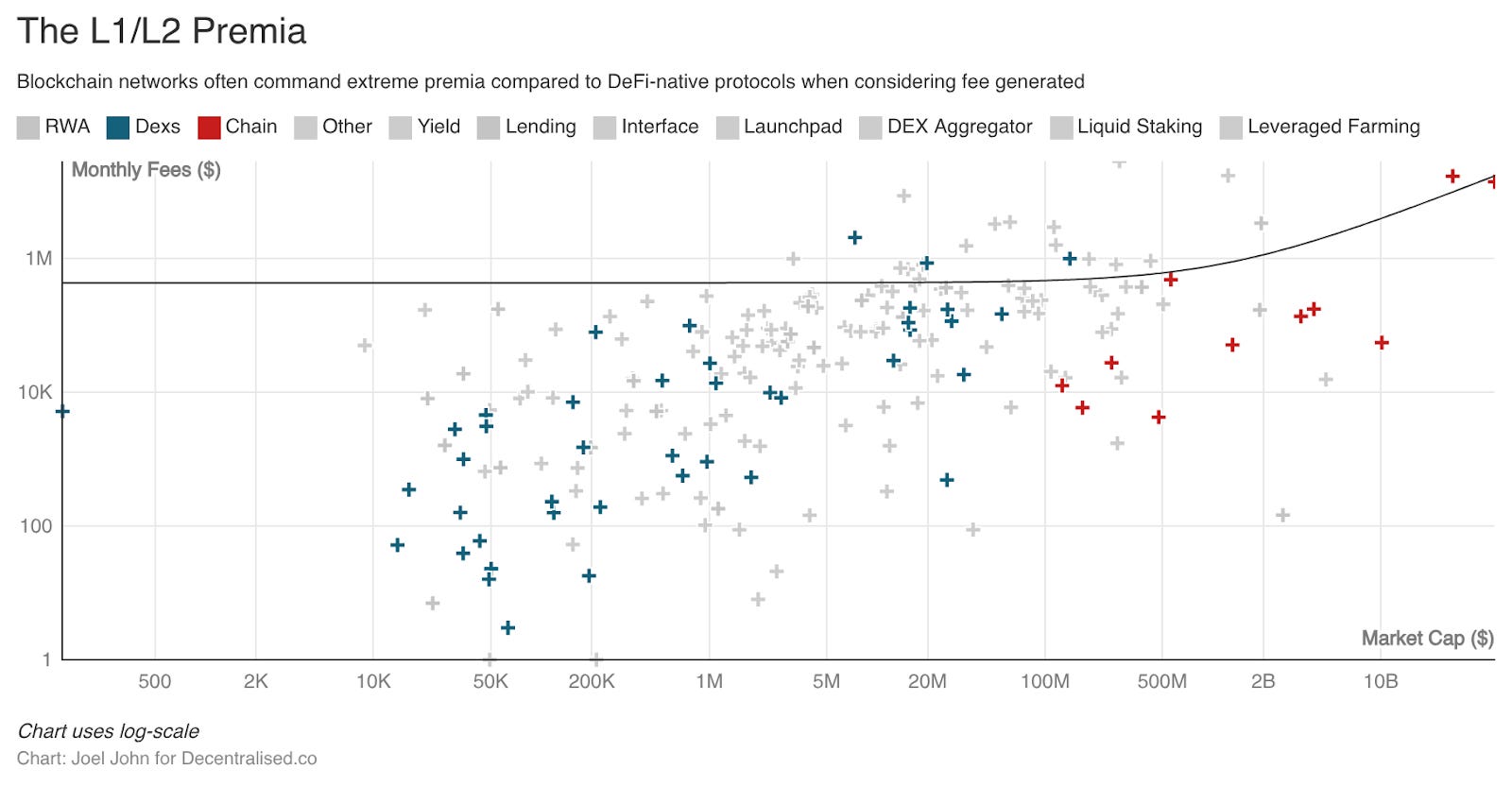 Historically, L1s and L2s have traded at extreme premiums compared to standalone infrastructure or ventures. That premium, when invested well, could have created new economies. It could have funded developers to build real applications that mattered to real people outside our industry. Instead, the open-source nature of the products and the ease with which things could be tokenised meant we had fifty replicas of the same thing across thirty networks, with broken composability.