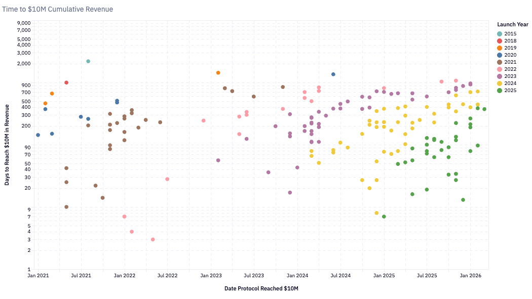 The number of teams doing over a million in revenue every quarter has steadily risen since the early 2020s. The figure is over one hundred. Protocols that took twenty-four months to reach $10 million in annual revenue in 2020 were considered fast. By 2024, protocols were reaching that milestone in approximately six months. Pump.Fun, launched in early 2024, reached $10 million in revenue in roughly two months, the fastest recorded trajectory.