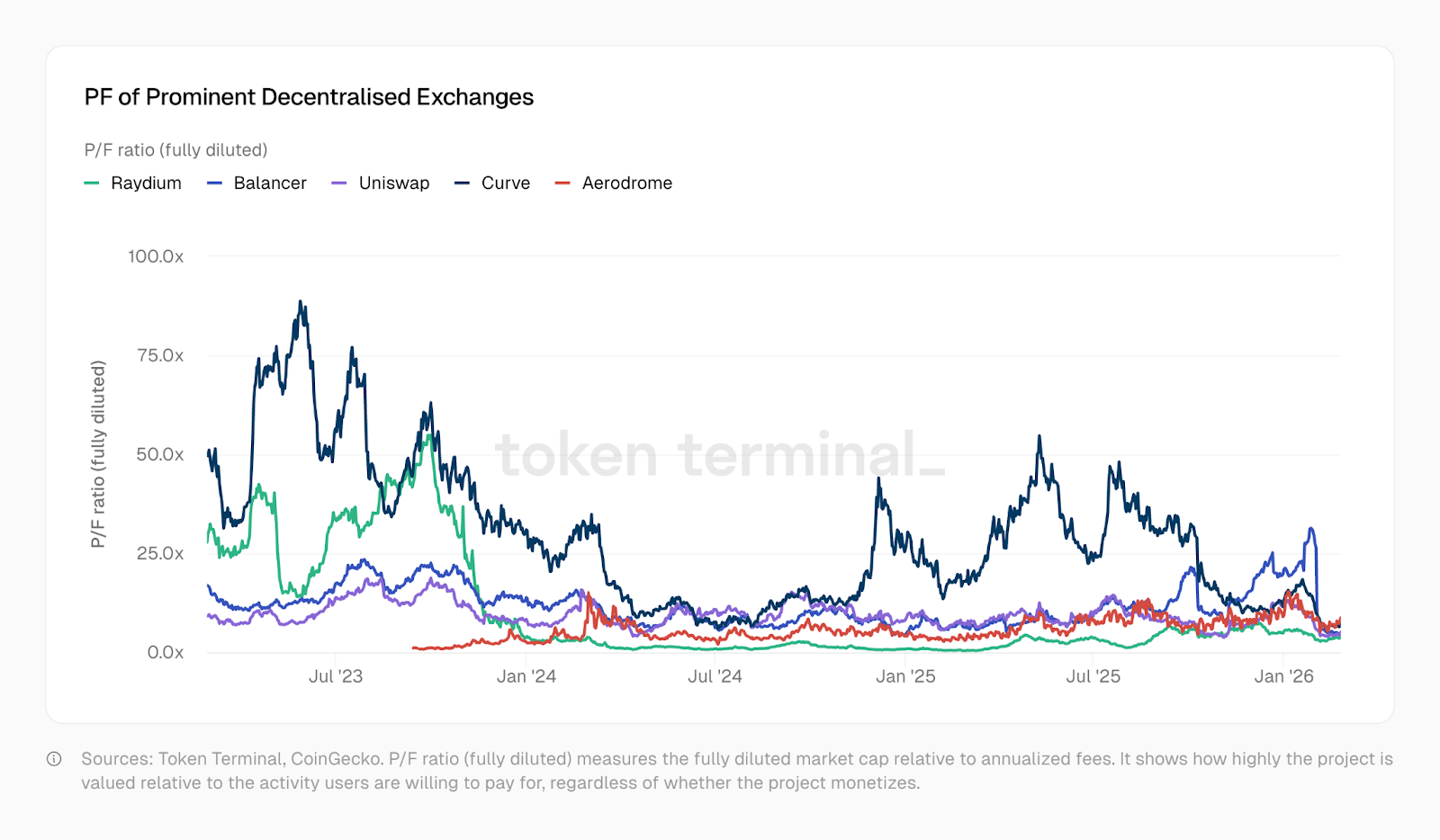 Consider the fate of DeFi primitives. Investor optionality and the lack of novelty butchered valuations, even when these primitives drove more economic activity. These are fragmented markets where investors have a multitude of choices to bet on. The novelty of being “decentralised” or on a blockchain has long since worn off. Kamino, Euler, Fluid, Meteora and PumpSwap have entered the chat - all at lower price-to-fee ratios than what protocols commanded in 2022. As the chart below from TokenTerminal shows, price-to-fee multiples of decentralised exchanges collapsed between 2023 and 2025. Some now trade at a multiple of 1.