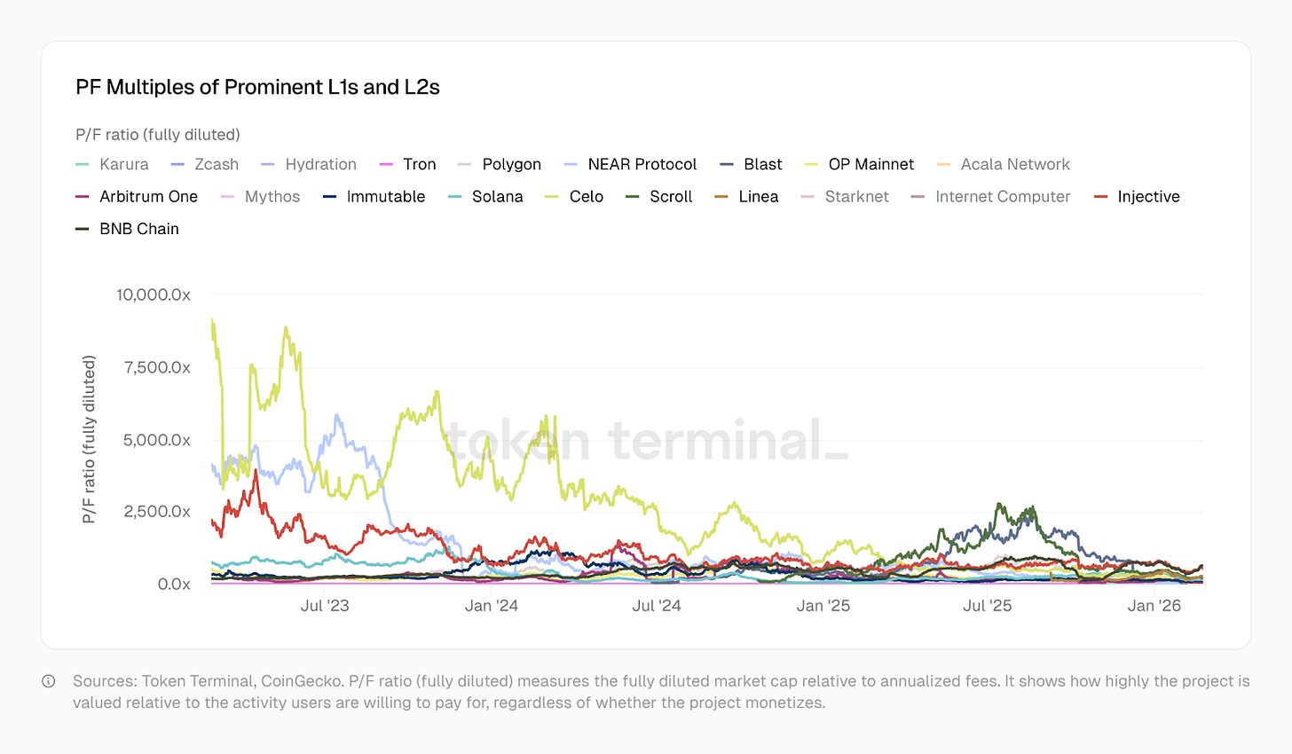 In January 2023, Optimism was trading at PF (price-to-fee) multiple of 465. Solana was at 706. Arbitrum and BNB were around 206. Today, Solana is at 138, Arbitrum is at 62, and OP is at 37. Polygon trades closer to a fintech company at 20. Tron sustains the stablecoin ecosystem and sits at a multiple of 10.2. Taken individually, Optimism, Solana, Arbitrum, and Polygon have enabled more sophisticated products in the years since. Each of them has more users, better liquidity and a more complex suite of financial applications built on top of them.