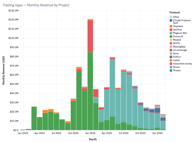 The primitives that we were all excited by in 2022 were now mature. Applications (such as BullX and Photon) were built on top of it. The sector alone created some $1.93B in fees between January 2024 and February 2026.