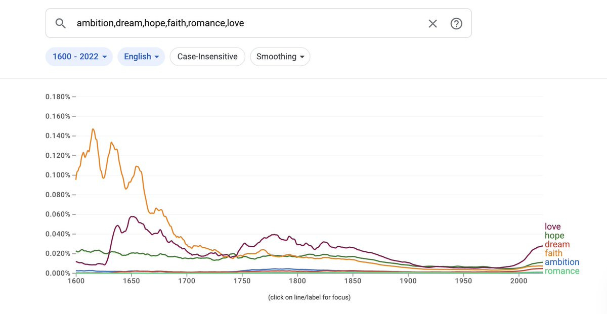 As you can see from the ngram above, the number of references to faith in literature has reduced. What took over was the term “love”. Now, I do not mean all of Europe gave up on religion and decided it is time to find better partners in life, but the nature of the medium did change. An instrument (the printing press) that initially spread the faith may have contributed to its downfall.