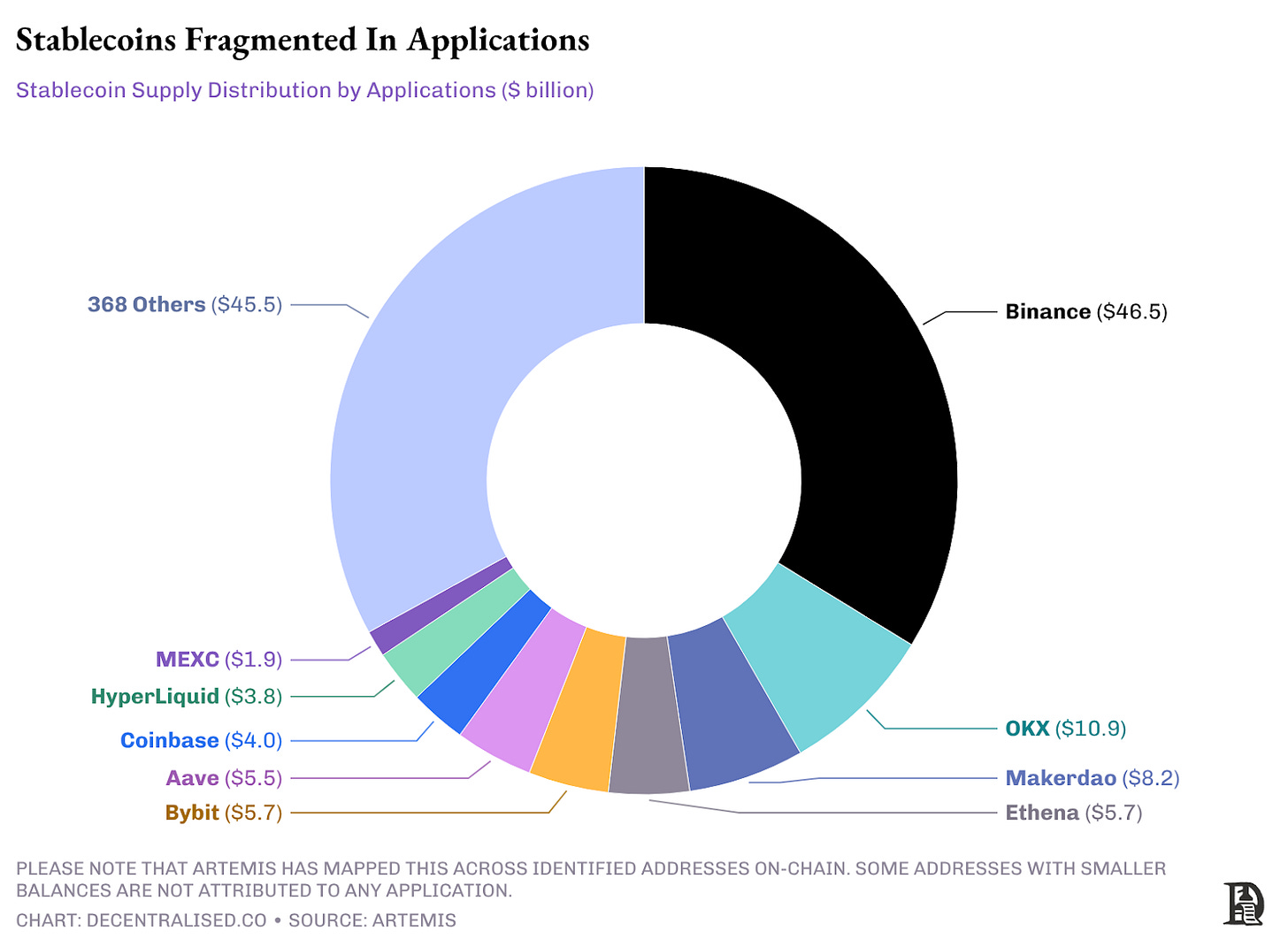 Starting with the number of instruments, the stablecoin market now exceeds $300 billion in total supply, up from roughly $205 billion at the start of 2025. Although Tether and Circle control ~85% of the market share, there are more than 50 issuers with over $100 million in supply. These stablecoins are scattered throughout applications on multiple chains. The chart below shows the distribution of stablecoins across applications.