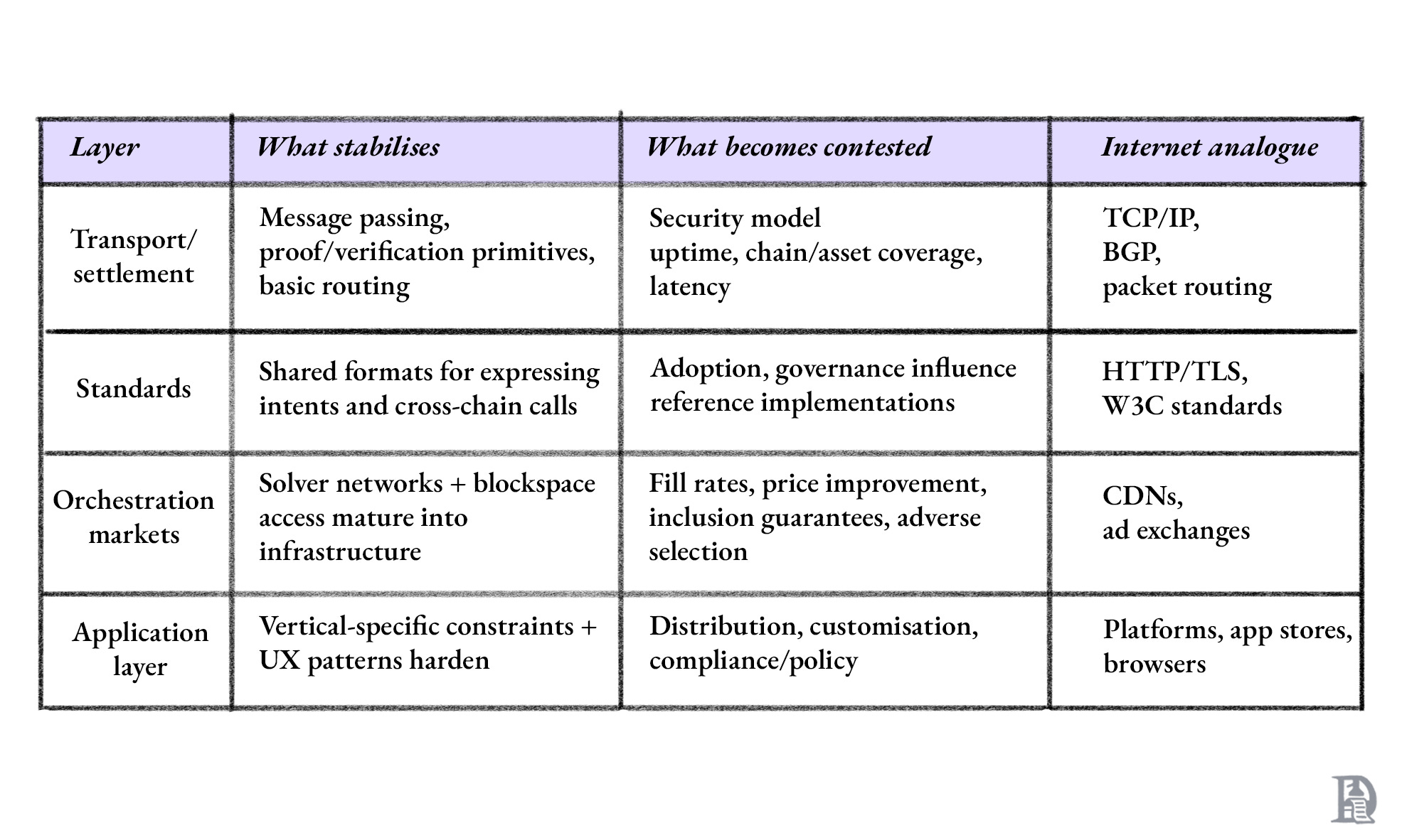 As this happens, bridges or DEXs will lose their identity. They fade into the background, as physical network infrastructure did once the Internet standardised its transport layer. Users and applications will stop thinking about which bridge moves their assets. They will care about whether assets arrive, and at what cost. In this world, the value migrates up the stack, away from the pipes and towards whoever coordinates the journey between what a user wants and where liquidity actually sits.