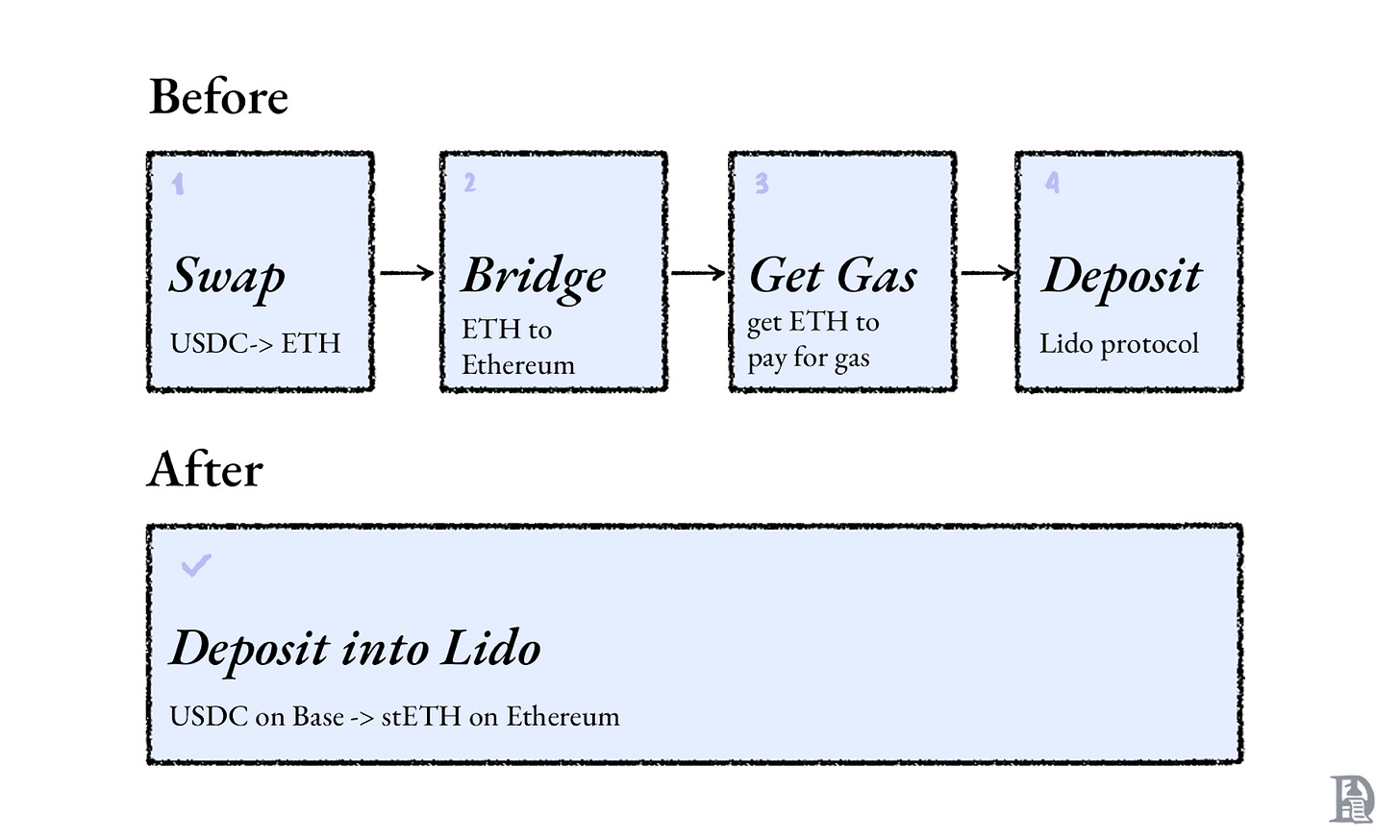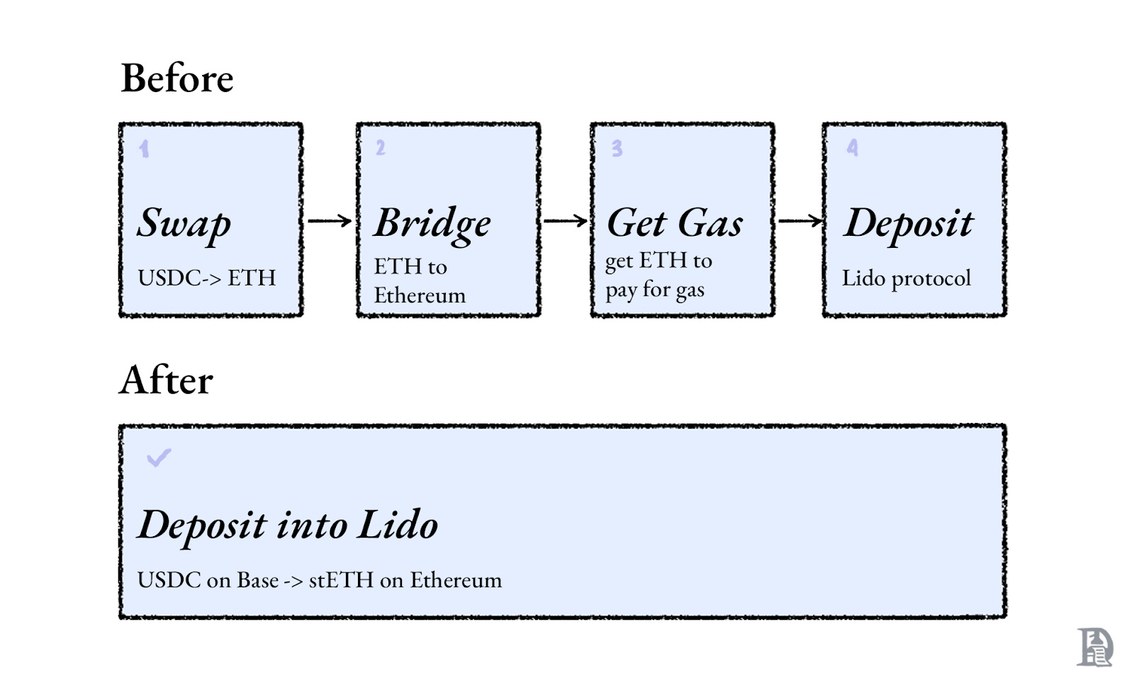 Let’s say you had ETH and wanted to deploy USDC in some lending pool on Avalanche. Aggregators would swap your ETH to USDC, bridge to Avalanche, but could not deposit into the lending pool because you didn’t have AVAX (the gas token) on the destination chain.