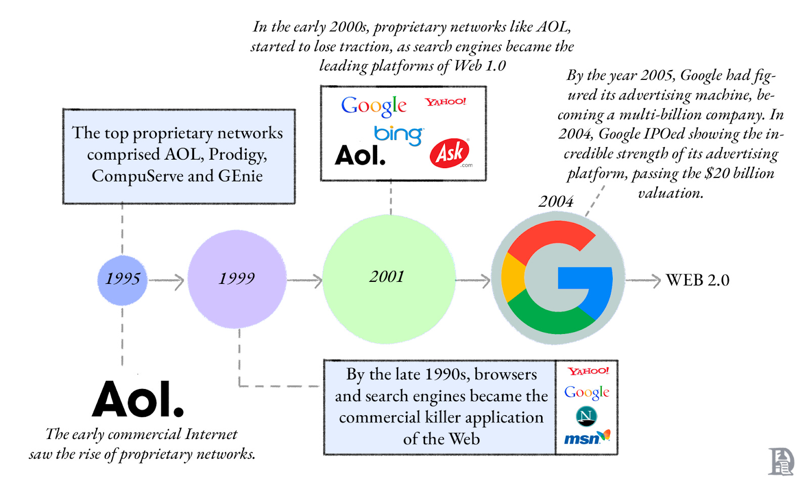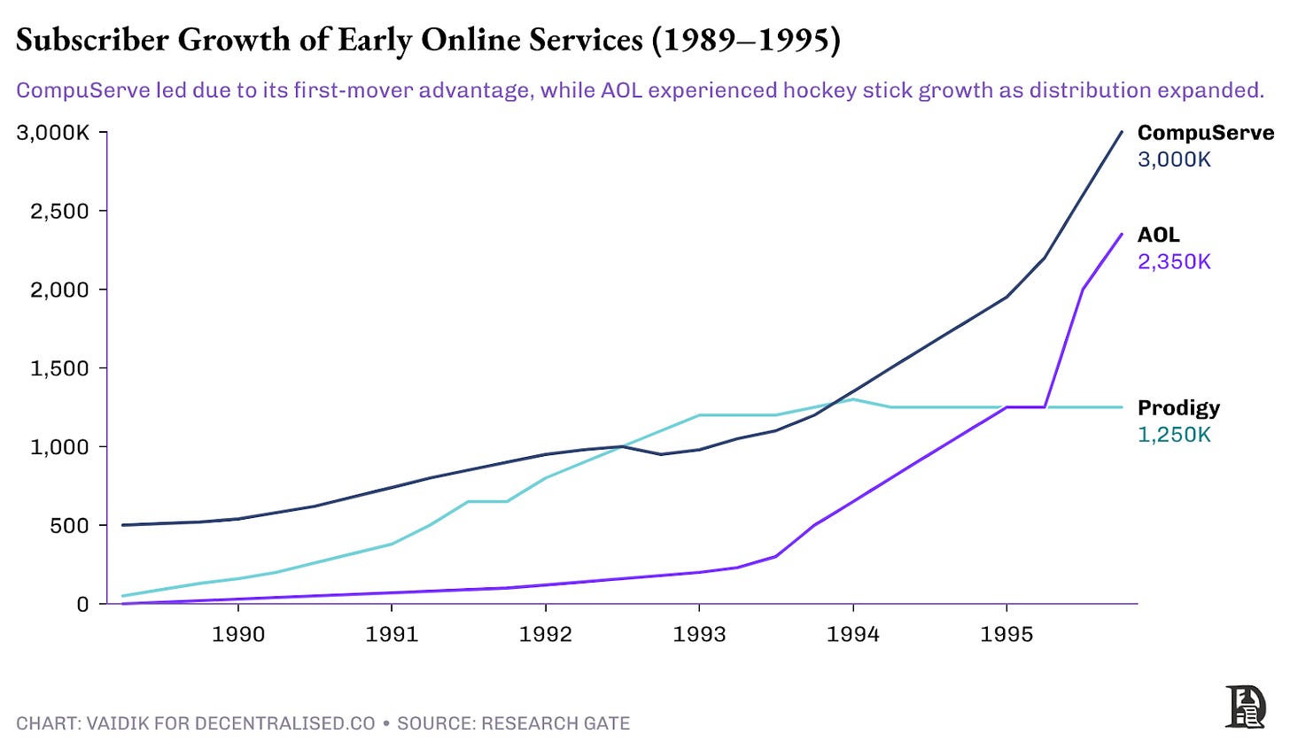 Crucially, this problem could not be solved by any single platform growing larger. Even as AOL scaled rapidly, it remained incompatible with other services. Growth improved coordination within a network, but did nothing to reduce coordination costs between networks.
