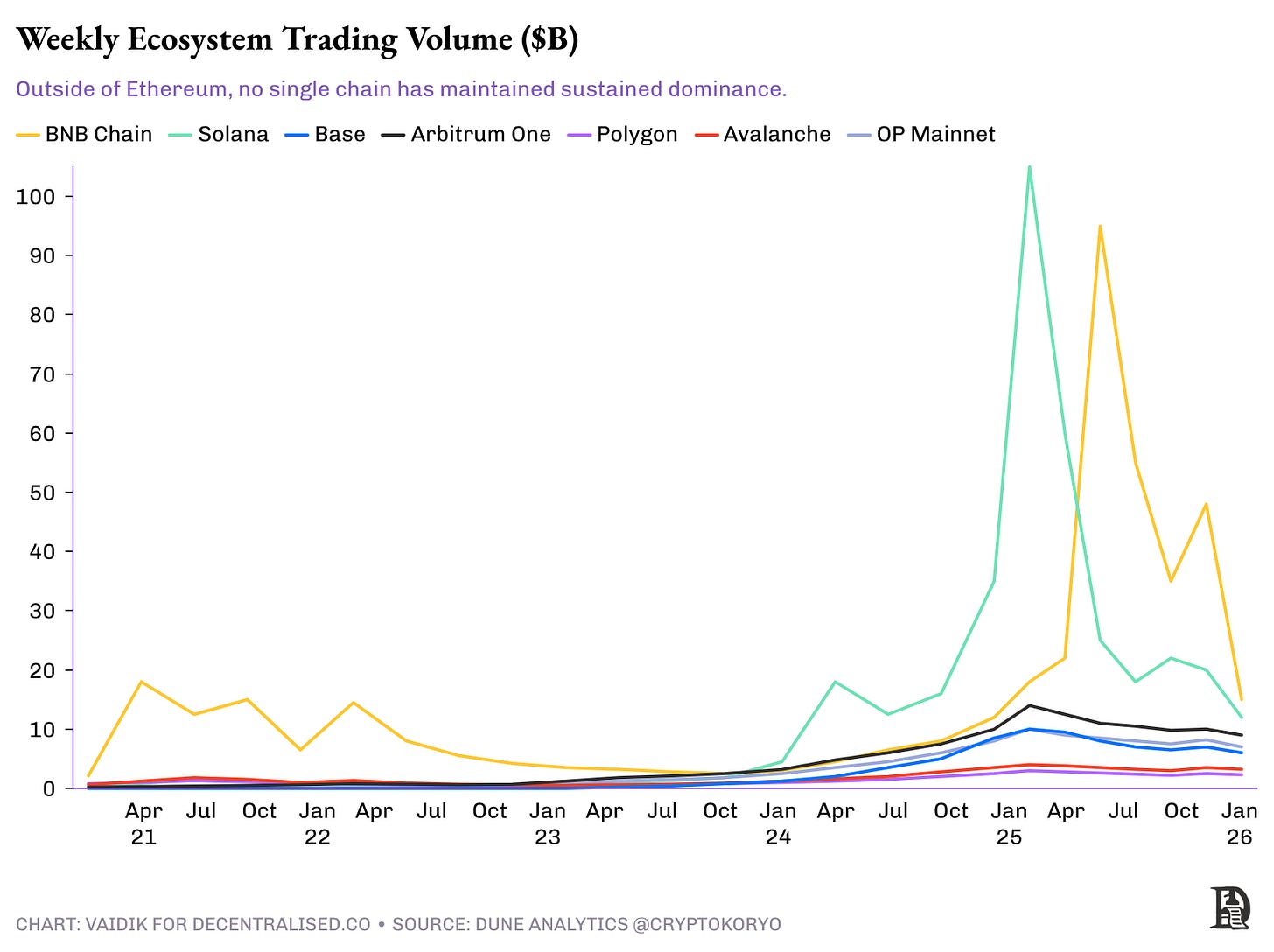 Teams took on this burden because blockchains were no longer just execution environments. They had become distinct markets. The chart below shows trading volume in different ecosystems. If you exclude Ethereum, there’s no clear winner. Applications could not afford to ignore other chains. Even if it were for a brief period, if your application were on a chain that attracted activity for any reason, you would stand to gain users.