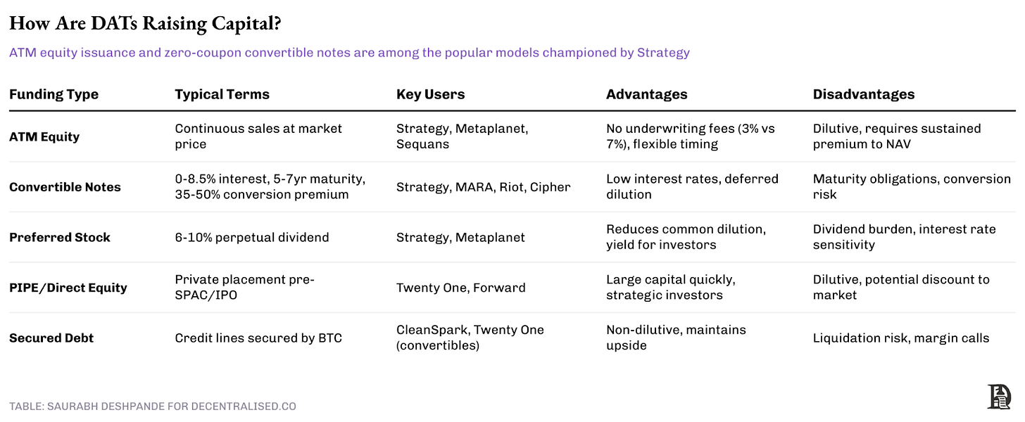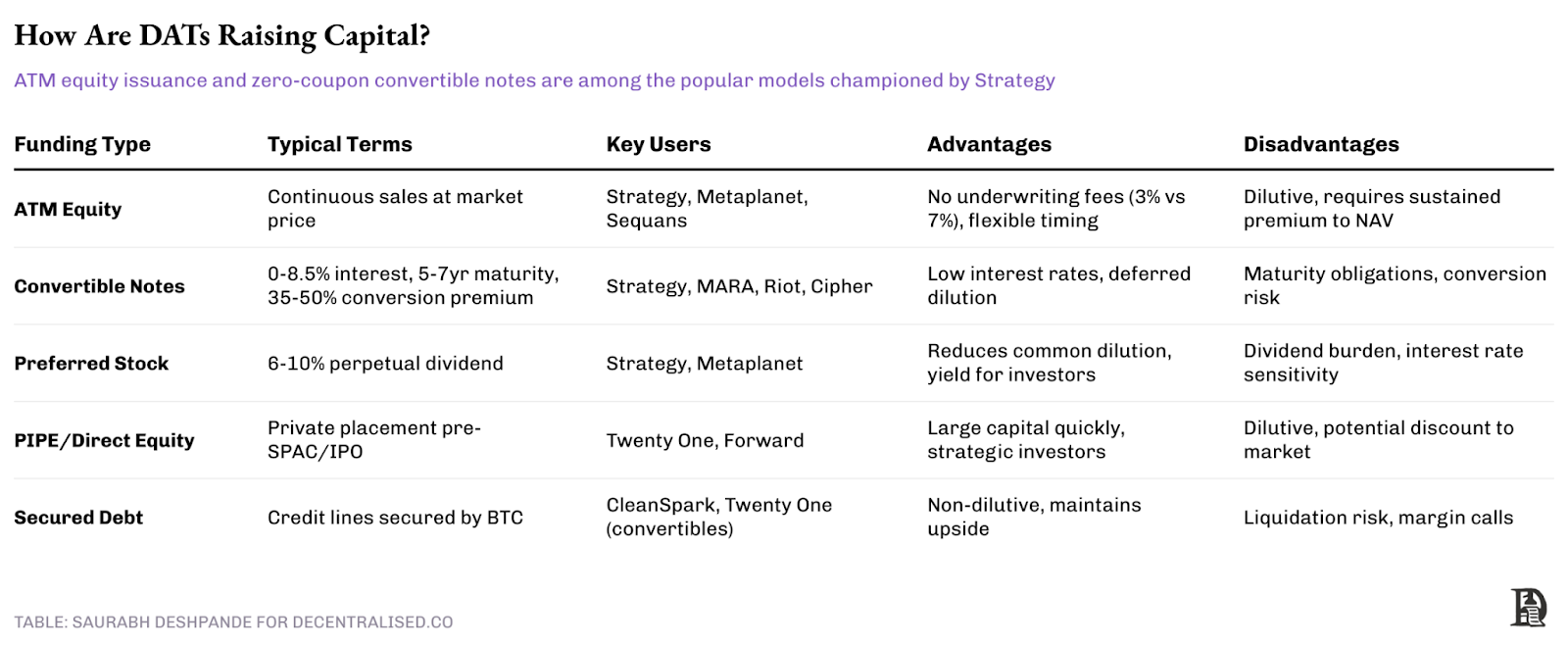 This creates tiers in the DAT market. Top-tier companies like Strategy issue converts at 0% and drip equity through ATMs at premium multiples. Mid-tier DATs issue converts at 2% to 3% and rely more heavily on equity. Bottom-tier DATs can only issue equity, often at compressed multiples, because they lack the scale to attract institutional interest.