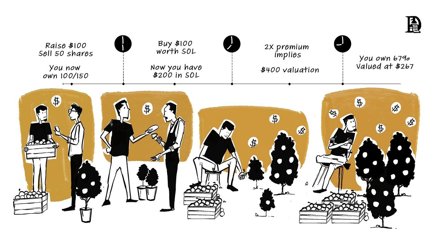 Now comes the accretive issuance. You want to raise another $100 to buy more Solana. Because you’re trading at 2x NAV, you only need to issue 50 new shares at $2 each to raise $100. You now own 100 shares out of 150 total, which means you’ve been diluted to two-thirds ownership. With that new $100, you buy more Solana, and that $100 worth of Solana also takes on the 2x valuation, adding another $200 to the company’s market value.
