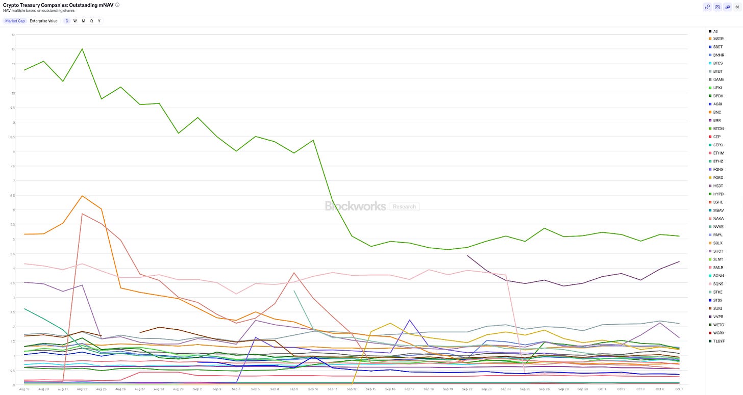 Estimates of the total assets held by all the DATs vary greatly because tracking hundreds of companies and their asset purchases is difficult. The Block quotes the value of assets held by DATs at $155 billion versus Blockwork’s $113 billion. Bitcoin is by far the most dominant asset, comprising more than 85% of the aggregated NAV.
