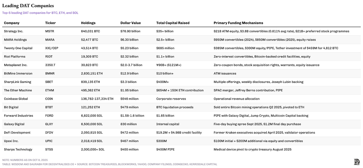 The combined liabilities of all DATs are ~$73 billion, which is about half of their combined NAV, according to The Block. Tom Lee, who led Bitmine Immersion Tech, is the second largest DAT, having raised more than $10 billion via ATM issuances in the last three months.