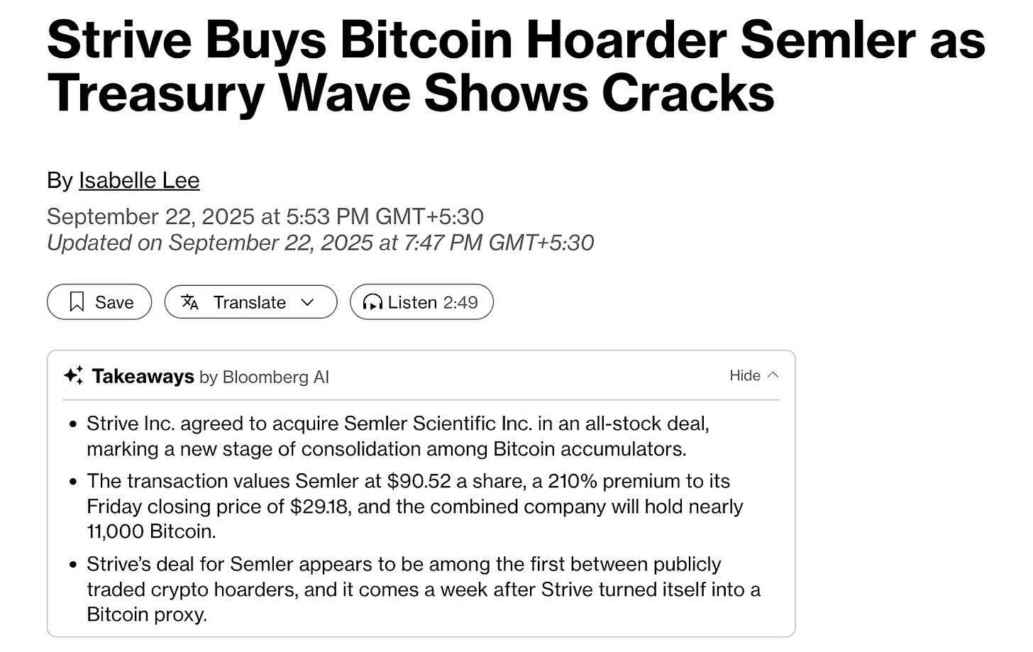 But 5048 BTC at ~$115,000 is approx $580 million. Then why is Strive paying $1.3 billion? Because it is issuing new shares to acquire a DAT.