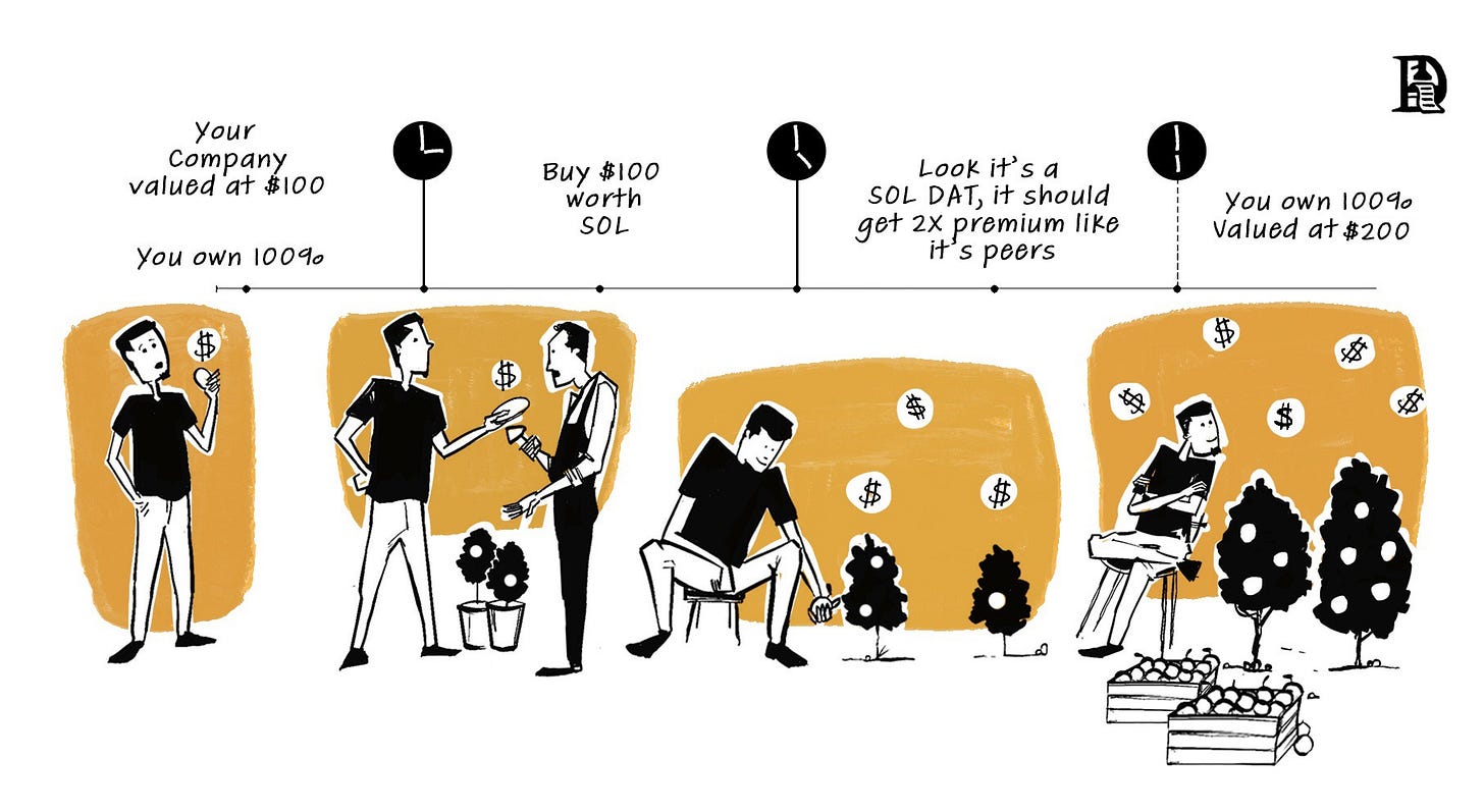 Assume that you want to create a Solana treasury company. You have a company worth $100, and you own 100% of it. You take that $100 and buy Solana. Now you own $100 worth of Solana DAT company.