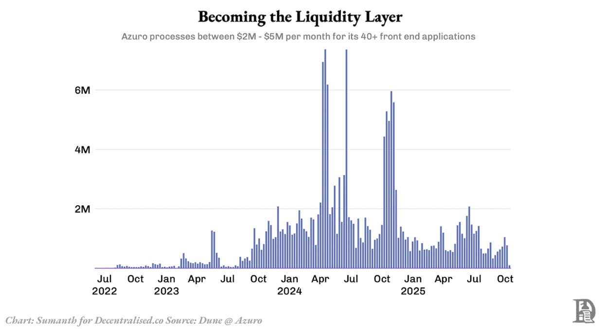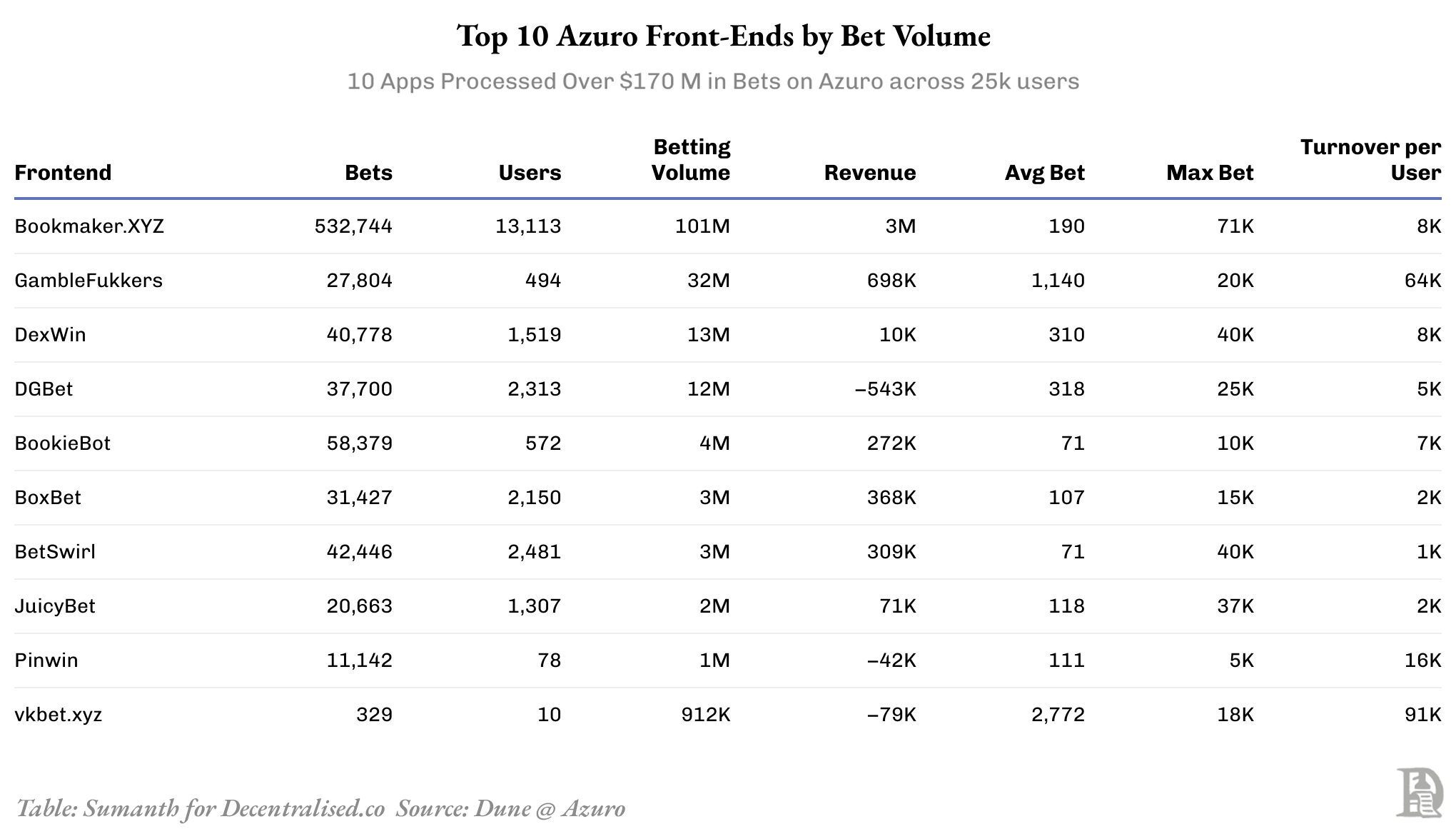 Azuro has processed $361 million in betting volume across 44 front-end applications. Activity grew steadily to over 23 million monthly transactions at its peak. The protocol has attracted over 34,000 unique users who’ve shown meaningful engagement, placing an average bet volume of $5,000.