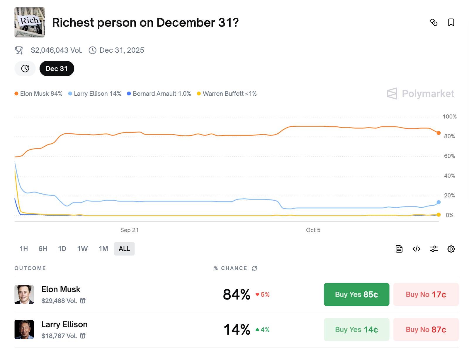 The problem is liquidity fragmentation. Each market needs its own set of active buyers and sellers, maintaining two-way pricing. A market on “Fed Decision on October?” might have 5000 active traders providing liquidity with $70M in open interest. However, a market on “Richest person on December 30” might have only 20 traders with $2 million in open interest. Thin markets have wide spreads, making them effectively untradeable. Market makers also step away when markets are shaky, as we saw in the recent $19B wipeout.