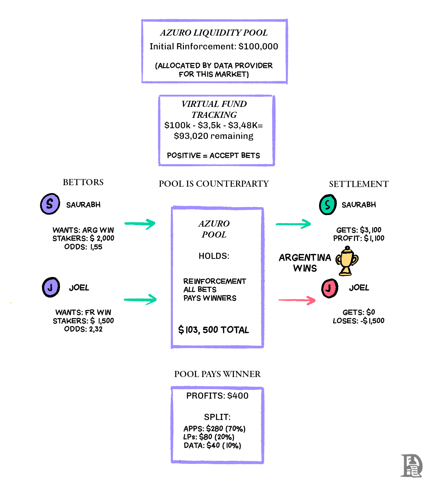Azuro democratises this position through its liquidity provision mechanism. Rather than William Hill’s family or Bet365’s Coates clan controlling all the upside, anyone can become a partial owner of the house by depositing capital into the protocol’s singleton pool.