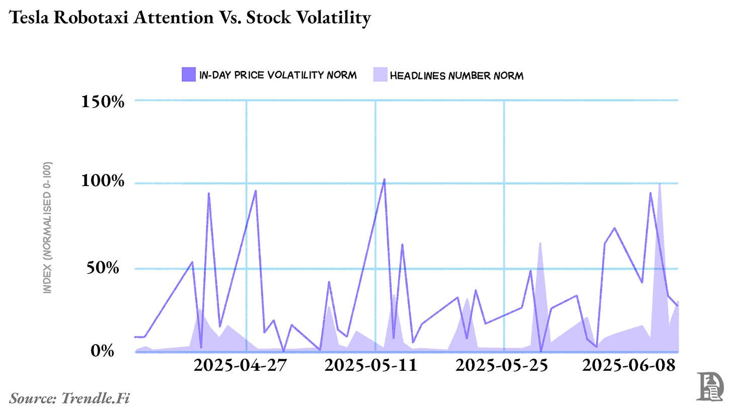 Take this chart, which overlays two normalised series: headline intensity about the “Tesla Robotaxi” and TSLA’s intraday price volatility over the same window. The spikes in TSLA’s share prices rhyme with the increase in the number of headlines mentioning Tesla Robotaxi.