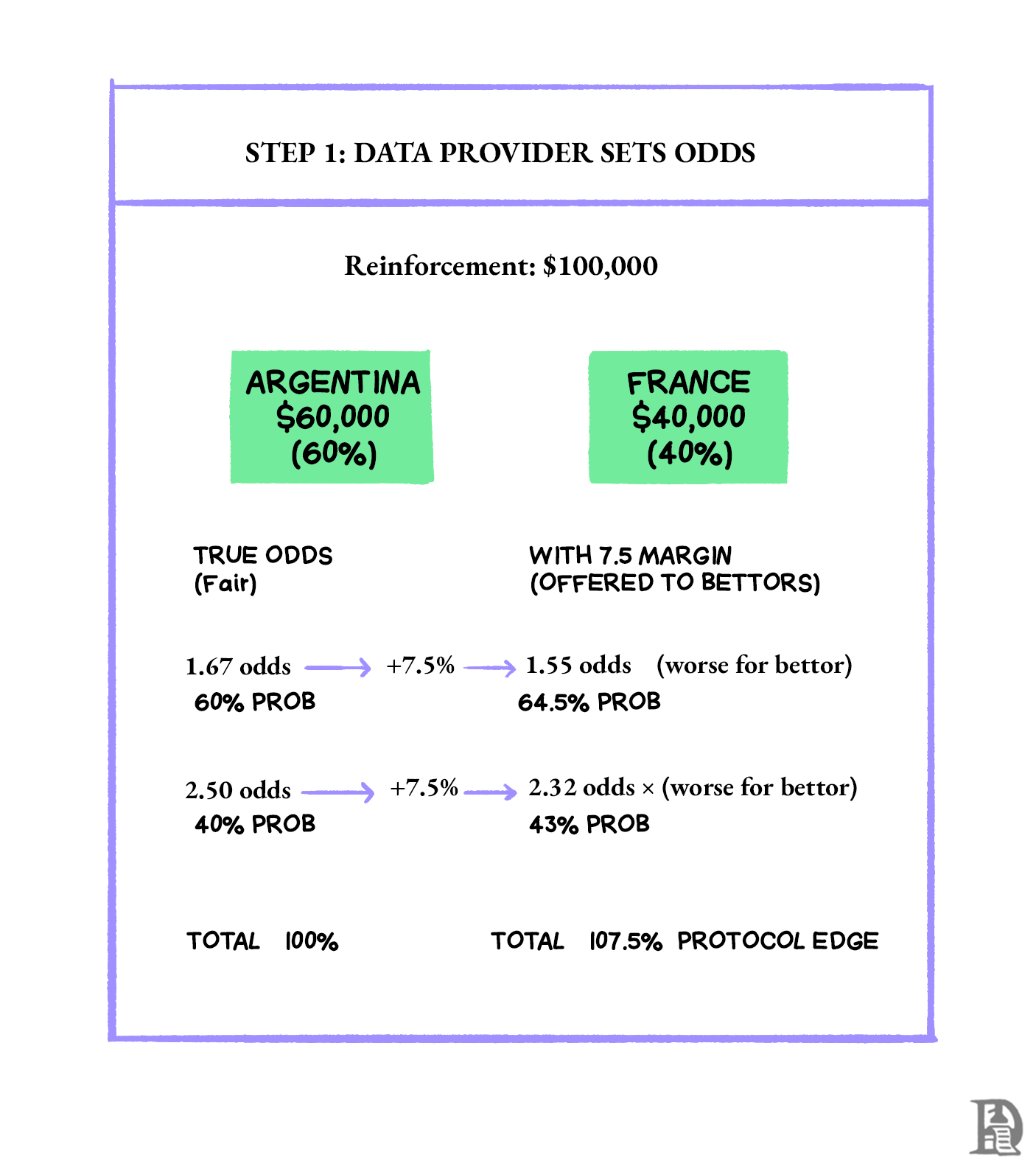 The protocol doesn’t actually offer these “true” odds to punters. Instead, it adds a 7.5% margin by increasing each probability by 7.5%, resulting in slightly reduced odds: