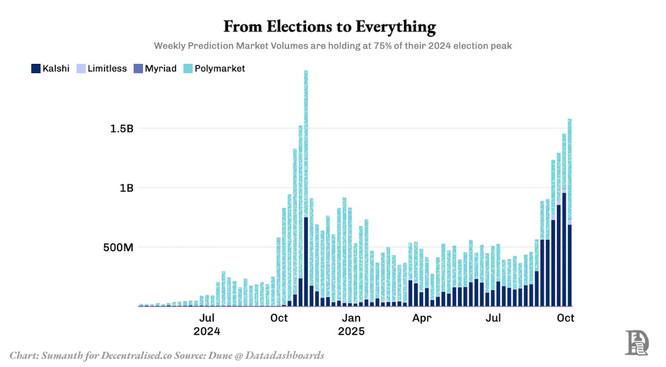 But in their current form, prediction markets cannot scale to fill that gap. Kalshi and Polymarket today handle around $1 billion a month. Global sportsbooks handle more than $20 billion in the same time. All of Polymarket’s election-year frenzy equals a single busy weekend for DraftKings, Bet365, and FanDuel combined.