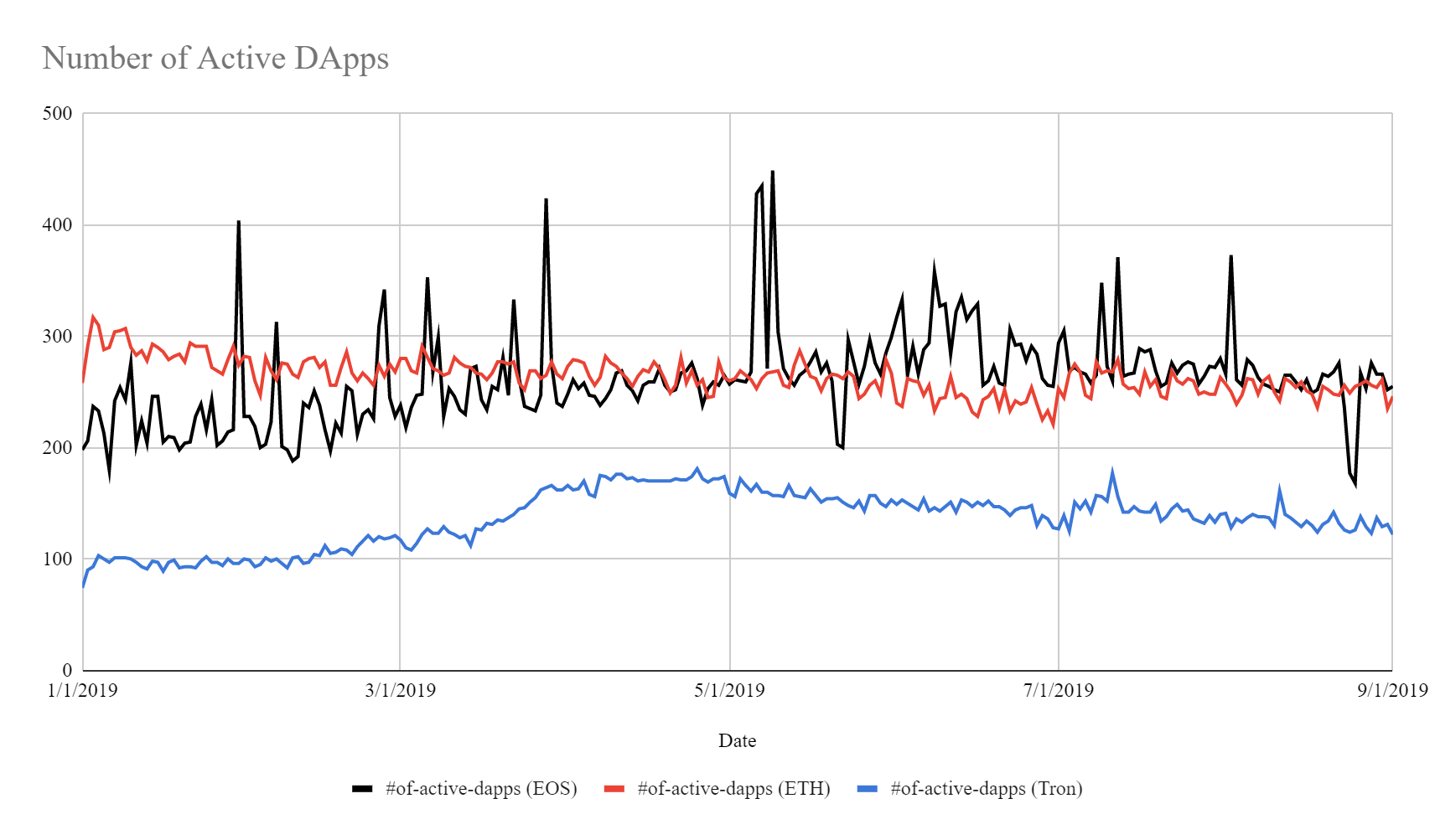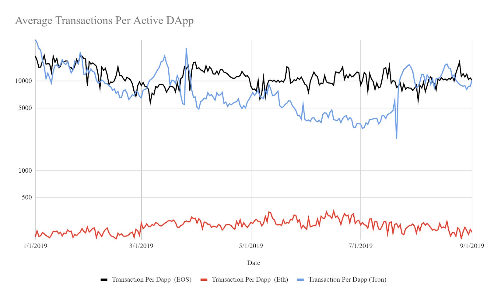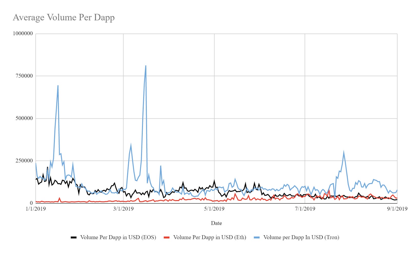 Although the number of transactions each DApp sees on EOS and Tron is considerably higher than that of Ethereum, when you consider the total volume they see on average - it almost converges at some points. This is not to suggest that EOS, TRON is lesser than Ethereum by any means but it could be a gauge for how organic use affects DApp ecosystems. Ethereum can move the same amount of volume to DApps with a fraction of the number of transactions EOS and Ethereum takes. This could be interpreted in two ways