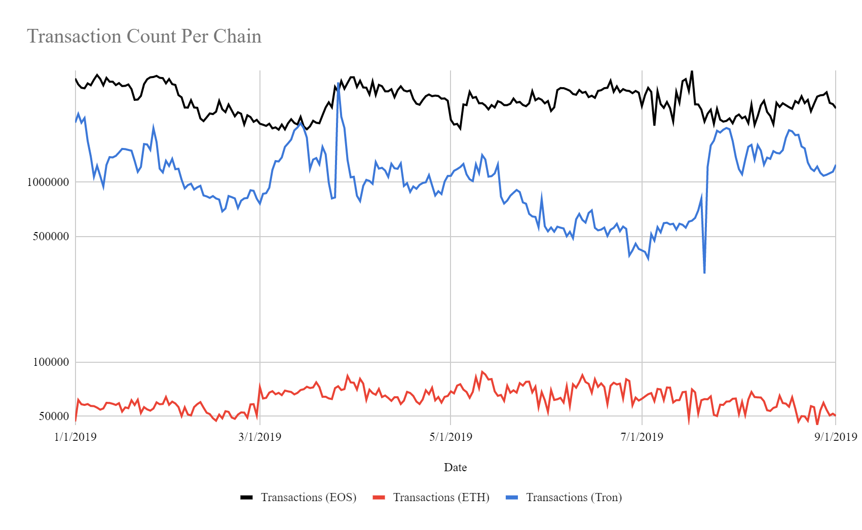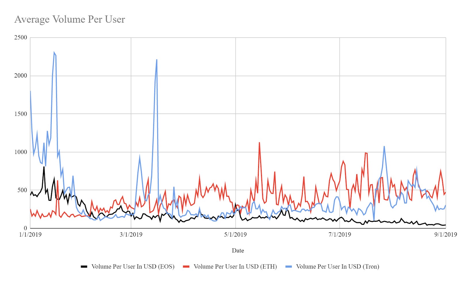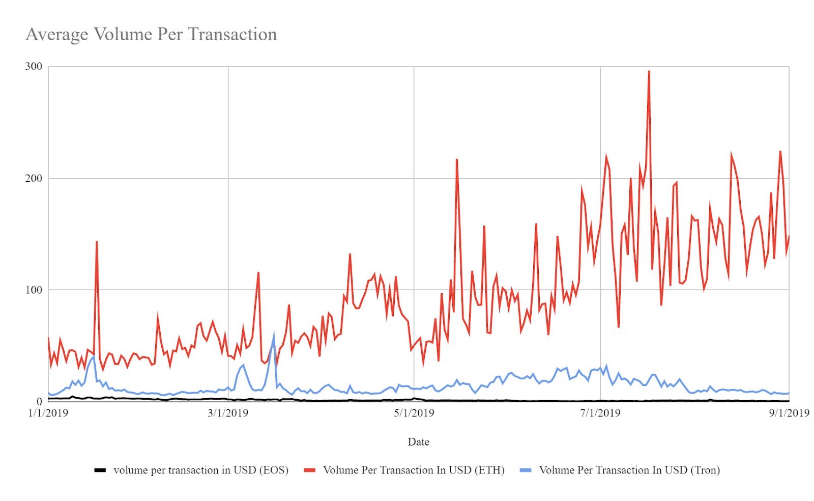 On basis of rough calculations - the figures I could come up with are for Ethereum, DApps contribute ~10% of all transactions, for EOS it is at a measly 5%, but for Tron - the figure is as high as 50%. As much as I'd like to jump to the conclusion that Tron's DApps ecosystem is the most vibrant and healthy, a few things make me wonder if the entirety of the system is being run by bots on Tron. To understand why we have to look at two metrics. One - is the average transaction done by each user on these chains, and the other is the average volume of a transaction on these chains. Keep in mind that bot-run accounts bring the average substantially higher.