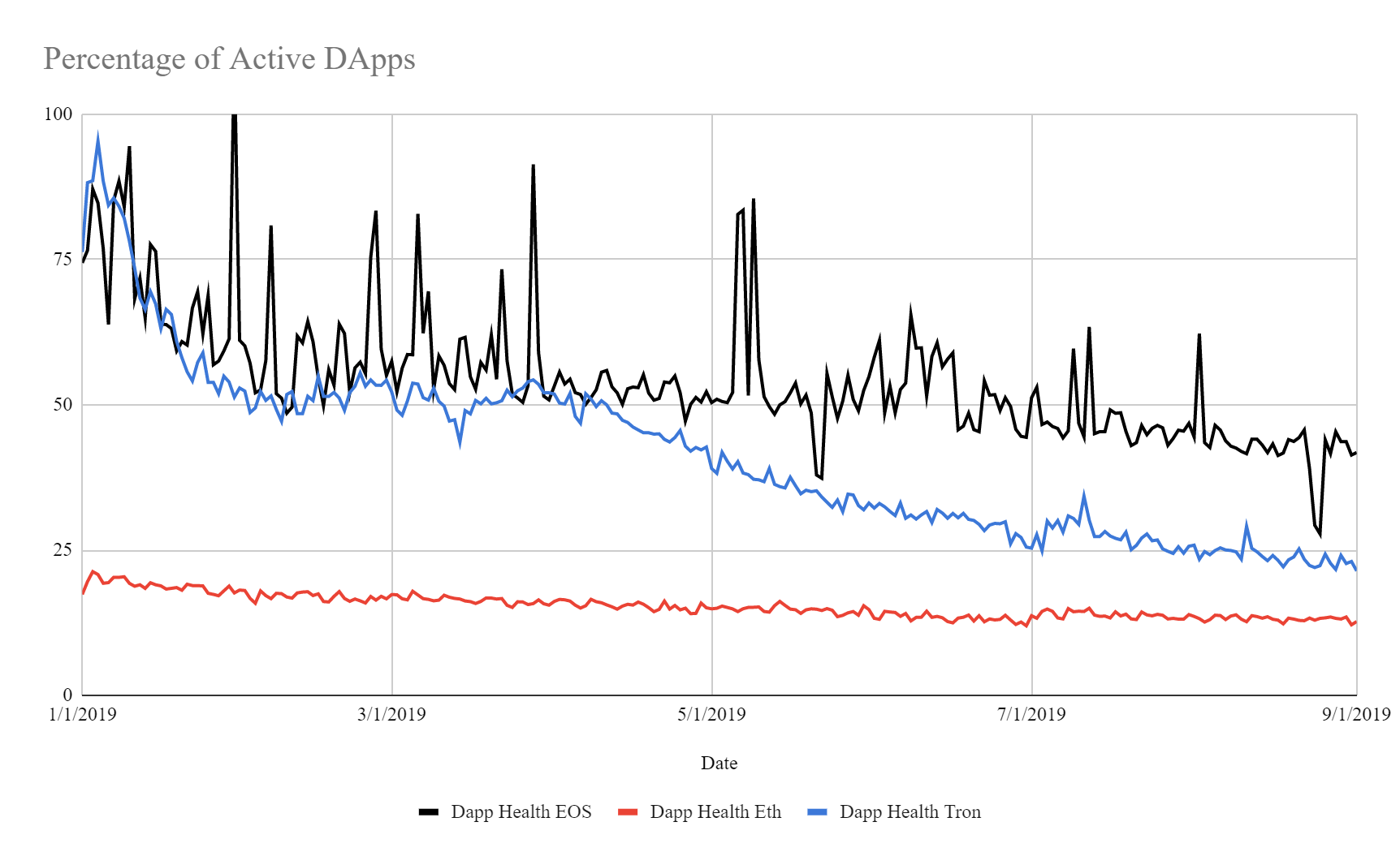 There is an active decline in the number of "active DApps" over time. What I refer to as "DApp Health" is a percentage metric I come to on basis of comparing the total number of DApps in the space with the number of active DApps at any given point in time