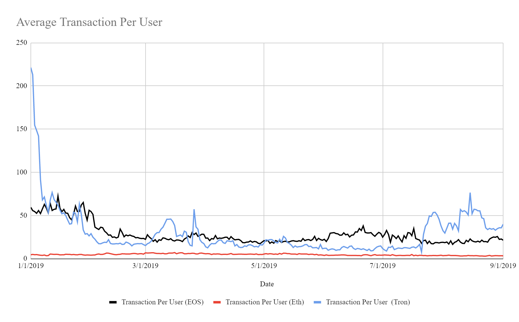 Eth is an outlier with a mere 4 transactions per user. A lot of it has to do with Gas requirements. Fees on Eth are considerably higher than those of EOS and Tron, making it a bad pick for instances where transactions are handled by a bot. However, it is in sync with what an average user would use a mobile app like one catering to food delivery or e-commerce. It is safe to assume that an average user would open a dApp 4 times to do a transaction. EOS and Tron however, live in a (botted) world of their own. Notice how Tron begins with 200 average transactions in January? I believe a lot of it has to do with (i) organic users testing the limits of the chain or (ii) a high number of bots engaging with the chain early on. As the DApp ecosystem around Tron matured, it came increasingly in sync with what a low fee chain like that of EOS looks like.