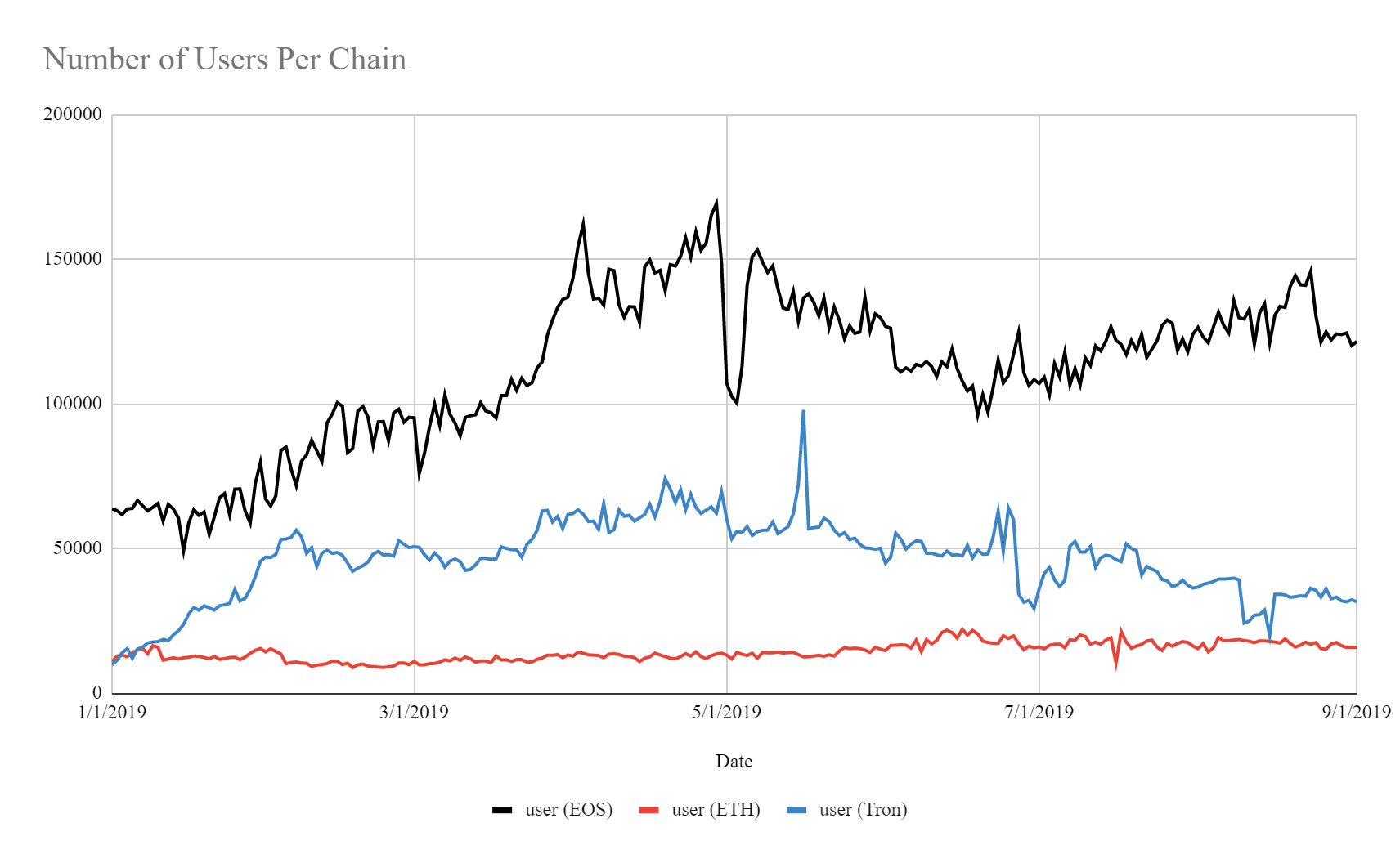 There is some figures that indicate to this. As shown in my piece on InstaDapp, ~80% of activity on a DeFi product could originate from a handful of whales. This reflects on the average amount moved by each user on Ethereum too. It is ~5x higher than those of Eth and EOSBots dominate EOS and Tron